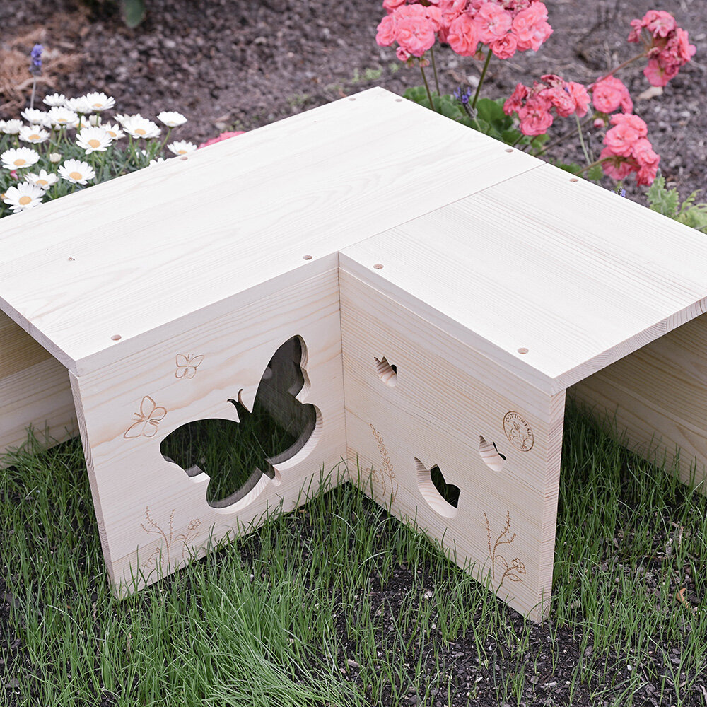 Das Tunnelsystem butterfly von unserer neuen grünhopper Holzmöbellinie "Cottontail". Zwei ausreichend große Öffnungen sorgen für ein bequemes Hineinkommen in das zuckersüße Tunnelsystem. Ein besonderer Hingucker sind die filigran gefrästen Blumen- und Schmetterlingsornamente. Eine besondere Aussicht können deine Kaninchen durch die Plexiglasscheibe in Schmetterlingsform erhaschen. Die verschiedenen Tunnel könnt ihr alle untereinander kombinieren, sodass ein Tunnelsystem ensteht, welches immer wieder verändert werden kann.