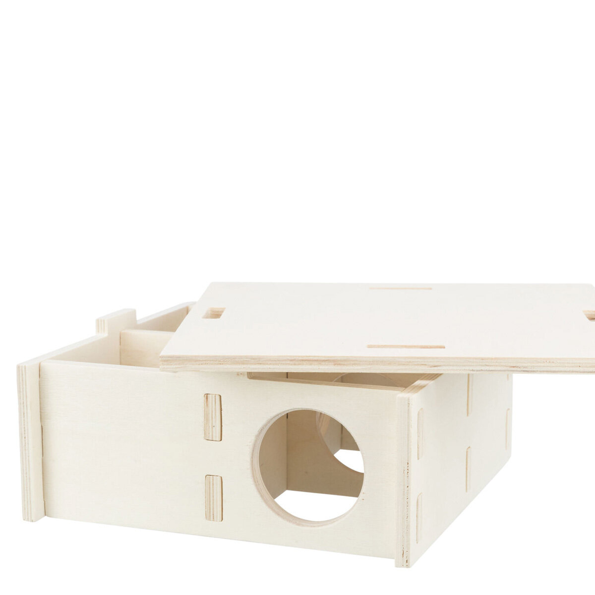 Natürliches Hamsterhaus aus unbehandeltem Holz für eine artgerechte Gestaltung des Nagergeheges. Das durchdachte Kammersystem ermöglicht deinem Hamster, seinen Bau strukturiert und sicher einzurichten – ganz nach seinem natürlichen Verhalten. Durch das praktische Stecksystem lässt sich das Haus schnell und einfach aufbauen – ganz ohne Klammern und Nägel.